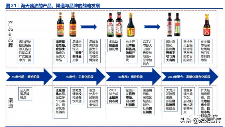 瓶装推广,企业改制,龙头显现。随着市场经济进入新阶段,酱油企业实现工业化生 产,瓶装酱油得到推广。不少企业处于国有改制阶段,仍在探索未来的发展趋势。行业的 渠道与品牌意识开始提升,其中海天味业当属领军者。为实现泛全国化,公司“巩固南方, 发展北方”,开启全国渠道网络的建设,在全国设立多个办事处,利用同一区域多个经销 商来建立竞争关系,加强公司的厂商掌控力。为打通餐饮渠道,公司通过赞助烹饪学校, 培养厨师使用海天产品的习惯,孕育了金标生抽和草菇老抽两款经典大单品。在品牌定位 方面,公司实施转型,从原先产品宣传变为企业宣传,树立“海天”调味品的形象。此时 的品牌宣传主要从地推入手,譬如积极参与佛山市政府在各外省市组织的博览会。由此, 海天味业逐步在酱油企业中脱颖而出。