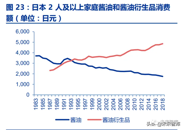 1)酱油总量饱和后被新型衍生调味品所取代。日本酱油行业二战后开启高速增长态势, 1973 年达到巅峰,行业年产量为 12.9 亿升,随后开始下滑。饮食的西式化是下滑的部分 原因,而主因在于以酱油为基底的衍生品替代了酱油,两者家庭采购金额出现了背道而驰 的现象。