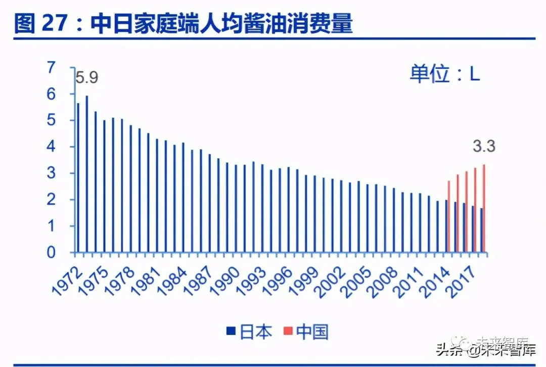 从销量维度看,我国酱油市场仍具备一定的提升空间。品类上,日本酱油下滑的主要 原因在于酱油衍生品对酱油的替代。两类皆属于咸味调味品,口味十分相似,区别在于消 费场景的细分。在中国,复合调味品行业尚处于发展早期,产品主要以酱类、火锅底料、 中餐调料包为主,咸味复合调味汁的推广还需时日。从销量角度看,中国家庭端人均酱油 采购量的确已超越日本,但我们认为两国经济发展水平及消费习惯所处的阶段不同,并不 能单纯的以当下时点进行对比。在可追溯的数据范围内,日本人均零售端酱油采购量的峰 值出现在 1973 年的 5.9 升,远高于中国 18 年的 3.3 升。从餐饮端来看,中国消费者家庭 烹饪减少的趋势愈发显著,虽然会影响家庭酱油采购量,但餐饮的特点在于调味品单位使 用量更高。酱油作为最大的细分及基础调味品,将受益于餐饮行业景气度的推动。因此, 我们认为中国酱油的需求量还未见顶。