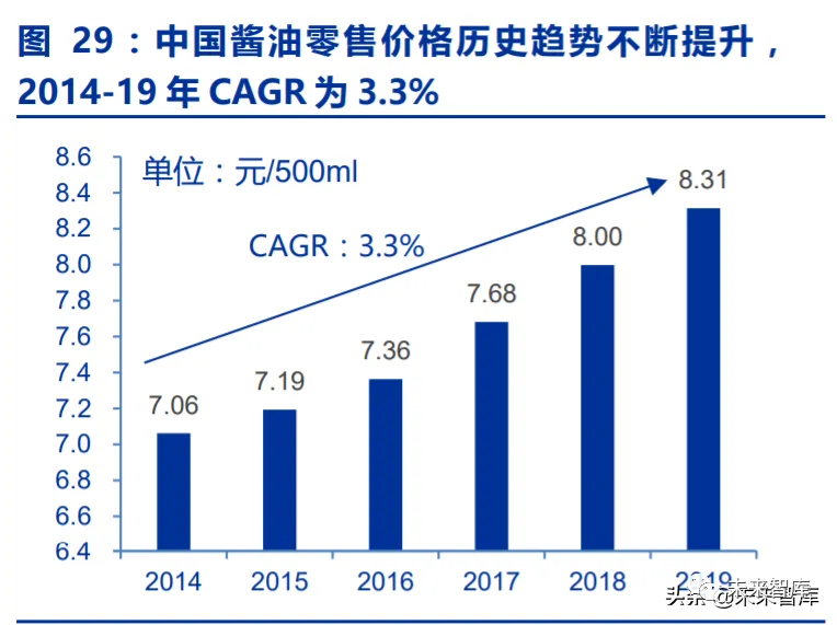 在功能细分及结构升级的推动下,酱油行业过去 5 年呈现量价齐升的态势。根据国家 统计局,2014-19 年酱油产量 CAGR 为 6.7%;根据 Euromonitor,2014-19 年酱油零售 价格 CAGR 为 3.3%。