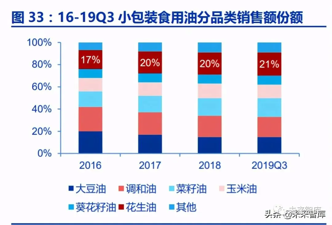 20 世纪 80 年代,居民消费观念相对落后,食用油以自家酿制和粮油店散油为主,购 买渠道单一。消费的油种主要集中在大豆油和棉籽油,局部地区出现花生油和猪油。随着 限制销售散装油的相关法规陆续出台,1991 年益海嘉里将散装油产品进一步精炼、调油 和灌装后,推出了第一瓶“金龙鱼”小包装食用油。由于消费者生活水平的提升和食品安 全意识的觉醒,小包装化趋势开始显现,中小包装食用油消费量迅速上升,逐步取代散装 油在市场的主要地位。对比散装形式,小包装食用油的“六脱”工艺更贴合健康理念,同 时包装规格多为 5L 以下,不仅便于选购,且符合传统消费习惯,更易受到消费者的青睐。