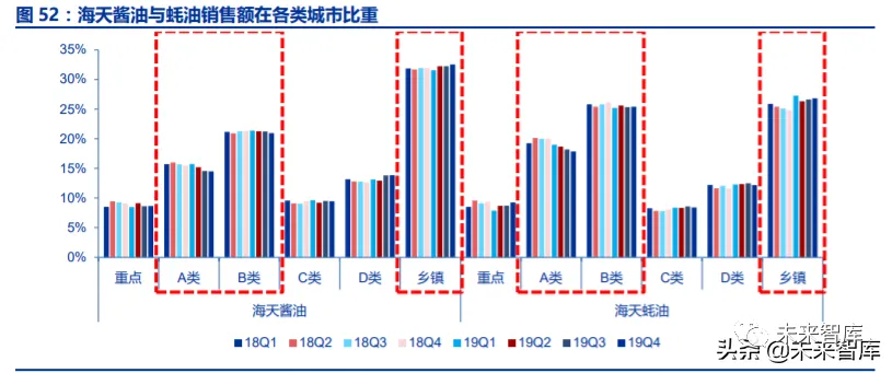 目前,蚝油处于渠道快速下沉阶段。尼尔森的渠道数据显示,海天酱油销售额渠道比 重以农村市场为主。另一方面,海天蚝油的销售主要集中在 A 类、B 类城市与乡镇市场, 表明蚝油在全国范围内处于渠道渗透阶段,未来扩容空间十分可观。在行业扩容之下,海 天味业将凭借自身优势预先收割市场份额,持续强化在蚝油赛道的绝对优势。