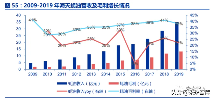 蚝油消费场景转型,由粤菜小众调料走向味觉系大品类,成长瓶颈得到突破。早期, 蚝油的消费场景局限于个别粤菜,如蚝油芥蓝、蚝油鸡等。在广东企业海天味业的技术攻 克下,腥味、黏稠度等缺陷逐步移除,使得该品类获得全国化推广的基因。在持续的消费者教育与市场培育之下,蚝油已逐步走向鲜味型大品类,受众群体扩大、消费场景多元化, 对传统的味精、鸡精与鸡粉或形成替代效应。受益于厨师的专业性,目前蚝油在餐饮渠道 已充分渗透。在家庭端,企业通过空中+地面的结合方式,树立蚝油“提鲜”的心智。