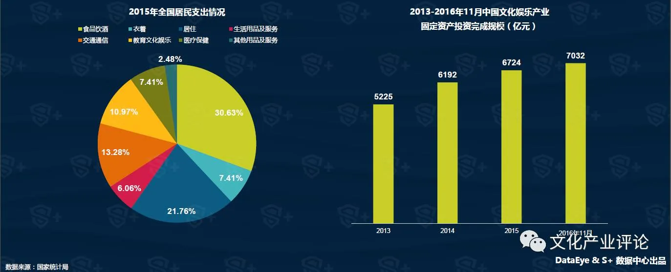 2015年全国居民在教育文化娱乐领域支出环比增长12%,是居民消费各环节中增速最快的。此外,2013-2016年国内文化娱乐产业投资一直保持向上增长态势,在2016年11月投资额已经达到7032亿元,可以看出资本市场看好文娱产业的市场成长空间及相对良好的未来回报。此外随着文学、动漫、影视、游戏为核心的泛娱乐IP, 被互联网原住民的80后、90后甚至更年轻的95后人群消费和传播,再加上国家政策的支持,加速了“泛娱乐”在社会中积极正面的舆论导向。