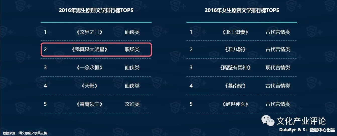 比较2015年的中国原创文学风云榜,2016年男生榜的TOP5作品更迭程度达到九成。从题材集中度上看,在男生原创文学TOP5中,玄幻、仙侠类作品平分秋色,而女生榜上古代言情依然是最有人气的作品类型。另外,都市职场类题材今年异军突起,相比去年玄幻题材作品垄断前五名,今年男生类作品在题材的丰富度上,呈现出更全面、均衡的发展态势。