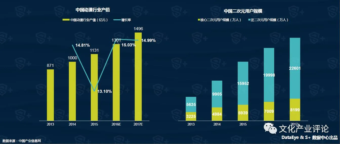 虽然2015年之后动漫行业产值增速预计略有放缓,但仍然将保持10%以上的较高年增长,预计中国动漫行业产值在2016年将突破1300亿元,在2017年达到近1500亿元规模。此外,动漫的主要受众,2015年我国核心二次元用户规模突破7000万,巨大的受众数量成为动漫产业持续发展的内生动力。