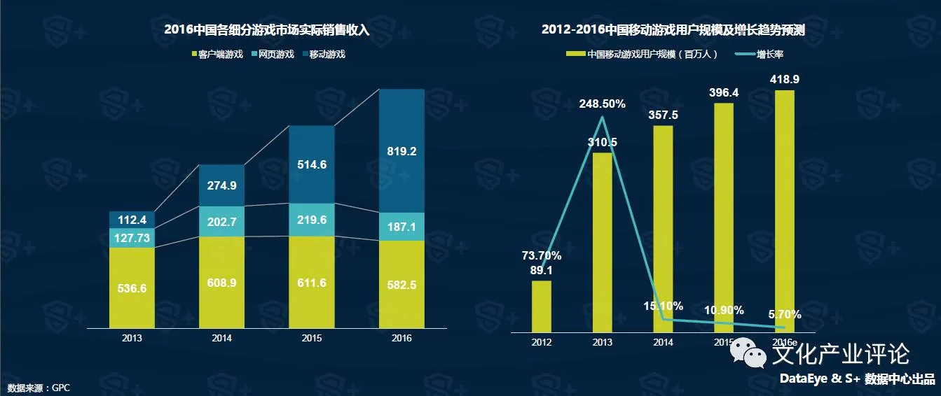 2016年,移动游戏超过客户端游戏,实际销售收入达到819.2亿元,同比增长59.2%。在用户方面,随着人口红利逐步消失,用户增长将趋于稳定,预计2016年中国移动游戏用户规模将达到4.19亿,同时各大厂商开始开辟海外市场,扩大厂商自身的游戏用户规模。