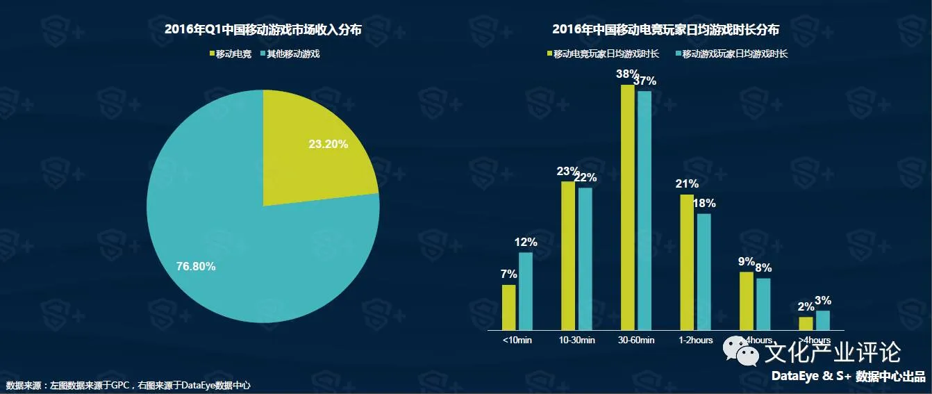 2015年移动电竞市场收入达到59.7亿元,2016年Q1移动电竞游戏收入已经超过41亿,增长迅速。从产品属性看,移动游戏的电竞化容易提高游戏本身的关注度、延长其产品周期。从数据上看,移动电竞游戏的日均游戏时长均比移动游戏的长,日均游戏时长大于30min的玩家超过60%。