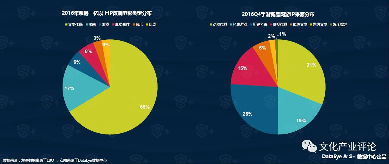 2016年由IP改编票房过亿的影片有37部,其中有两部游戏改编的作品且均超过5亿,如游改电影《魔兽》以14.7亿的成绩高居榜首。此外,在新品网游IP来源中,有别于第三季度,影视作品IP源从上一季度的4.5%提升到15%。