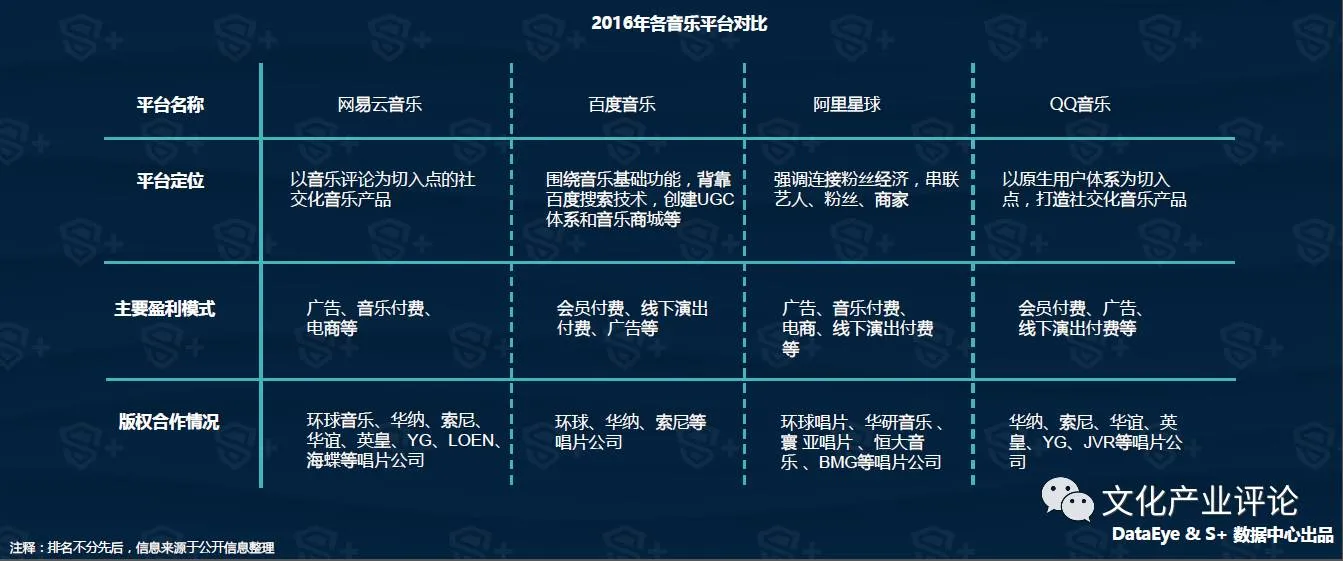 网易云音乐基于音乐社交评论功能,吸引了大量的活跃用户。百度音乐背靠百度搜索引擎的大数据和坐拥太合音乐的资源池,从内容生产到演出活动、粉丝社群,都是百度音乐与其他对手进行差异竞争的支点。阿里星球则定位为阿里粉丝明星娱乐交互平台,涵盖粉丝社区、应援任务、现场直播等内容,更多强调粉丝经济。此外,QQ音乐以微信、QQ的原生用户体系为支点,具有很强的用户粘性,通过演出活动O2O、专辑售卖等作为赢利点。