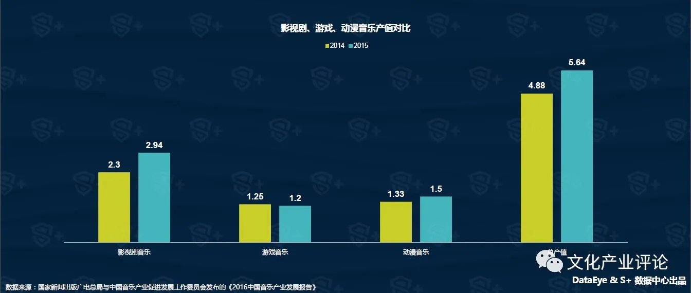 2015年,我国影视剧、游戏、动漫音乐的总产值约5.64亿元,同比增长15.6%。如2015年《大圣归来》、《大鱼海棠》等一批国产精品动漫出现,和影视、游戏行业产业的资本的不断涌入,都为影视剧音乐、游戏音乐、动漫音乐未来的产值增长提供了助力。