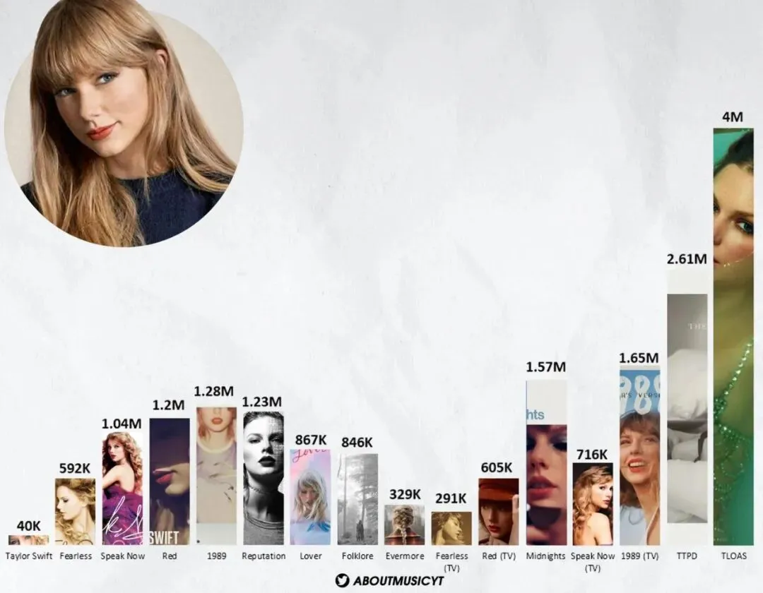 Nielsen Music和IFPI数据显示,大多数流行歌手的最高销量专辑集中在前三到五张,但泰勒·斯威夫特在发行到第12张专辑时,仍在不断刷新纪录,这在行业中非常罕见。显然,她找到了个人音乐事业增长的“第二曲线”。
