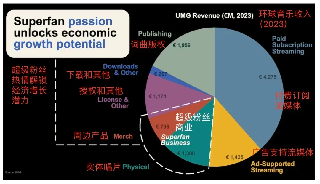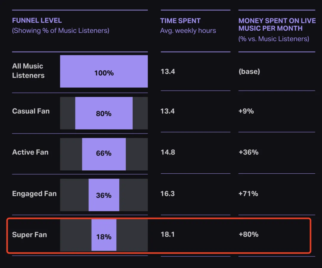 与过去常说的“粉丝经济”不同,“超级粉丝经济”是针对流量经济创造的新概念:因为流量经济无法充分实现音乐价值,所以需要在流量经济基础上提升一个层级,提供更多渠道让真正忠实的粉丝(Superfan)支持音乐人,从而形成更深度、更持久的商业循环。