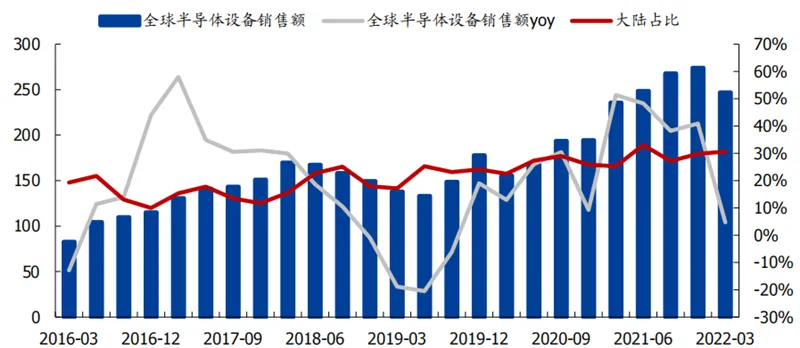 生产效率及降低成本因素推动下,全球 8 寸扩产放缓,12 寸晶圆厂扩产如火如荼。2020 年以来,国内 12 寸晶圆厂遍地开花,除中芯国际外,闻泰、格科微、海芯等公司纷纷计划建设 12 寸晶圆厂,粤芯半导体、华虹无锡等 12 英寸生产线陆续建成投产。根据 SEMI,2019 年至 2024 年,全球至少新增 38 个 12 寸晶圆厂,其中中国台湾 11 个,中国大陆 8 个,到 2024 年,中国 12 寸晶圆产能将占全球约 20%。大量晶圆厂的扩建、投产,将带动对上游半导体设备的需求提升,更有望为国产化设备打开发展空间。中芯国际 2021 年资本开支维持高位,达到 45 亿美金(大部分用于扩成熟制程,尤其是 8 寸数量扩 4.5 万片/月),预计 2022 年达到 50 亿美金。华虹 2021 年全年资本开支 9.39 亿美金,其中 8.39 亿美金用于 12 英寸扩产,0.99 亿美金用于 8 英寸产能。公司 2022 年规划资本开支超过 15 亿美金,其中 12 寸产能从 65K 增加到 95K,资本开支预计 14 亿美金,8 寸厂升级提升效率,预计开支约 1.8亿美金。根据公司 2022Q1 法说会,华虹无锡二期规划开始进行,技术上延展特色工艺平台,相关工作在抓紧推进中。合肥长鑫从 19nm 向 17nm 转移,加速技术提升,在北京设厂进一步扩产。长江存储 2019 年开始量产 64 层 3DNAND,2020年 4 月发布 128 层 3DNAND,2022 年 8 月正式推出基于 Xtacking3.0 技术的第四代 TLC三维闪存 X3-9070,相比上一代产品,存储密度更高,I/O 速度更快,高达 2400MT/s,提升 50%,并采用 6-plane 设计,在性能提升超过 50%的情况下,功耗降低 25%。此次新品推出,公司加速追赶步伐,进一步缩小与海外龙头差距。长江存储二期合计规划产能 30 万片/月,合肥长鑫规划三期产能,全部投产后达到 36 万片/月。长江存储、合肥长鑫作为国内存储产业发展重镇,在打开存储产业国产替代局面中具有重要作用。并且国内的存储产业对于半导体设备及材料都将具有重要的拉动作用。根据SEMI,2021 年半导体设备销售额 1026 亿美元,同比激增 44%,全年销售额创历史新高。大陆设备市场在 2013 年之前占全球比重为 10%以内,2014~2017 年提升至 10~20%,2018年之后保持在 20%以上,份额呈逐年上行趋势。2020-2021 年,国内晶圆厂投建、半导体行业加大投入,大陆半导体设备市场规模首次在市场全球排首位,2021 达到 296.2 亿美元,同比增长 58%,占比 28.9%。展望 2022 年,存储需求复苏,韩国预计将领跑全球,但大陆设备市场规模有望保持较高比重。