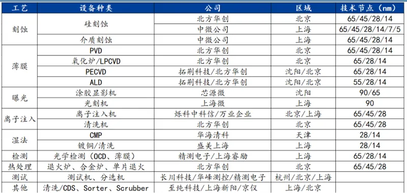 从国内晶圆厂招投标情况,设备各个环节均有突破进展。华虹无锡 2022 年上半年招标刻蚀设备 49 台,其中 Lam 中标26 台,TEL 中标 5 台,中微公司中标 13 台,北方华创中标 4 台。中微公司中标的 13 台具体为氧化膜等离子体刻蚀机 8 台,钝化膜等离子体刻蚀机 3 台,氮化硅等离子体刻蚀机 2 台;北风华创分别中标多晶栅等离子体刻蚀机 2 台和有源区等离子体刻蚀机 2 台。
