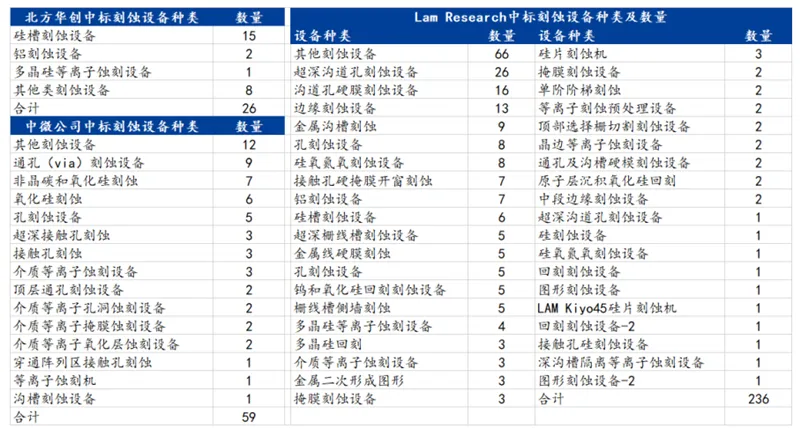▲Lam Research、北方华创、中微公司中标长江存储的刻蚀机台种类及数量(台)