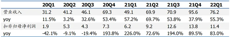 根据招标网的数据统计,华虹无锡 2022 年上半年招标测试设备 57 台,其中 TEL 中标20 台(19 台测试探针台),是德科技中标 8 台,DISCO 中标 4 台,广立微中标 3 台,均为高性能并行电特性测试仪。积塔 2022H1 招标测试设备 16 台, TEL 9 台,上海友能4 台背面工艺测试测试机。设备行业核心公司(北方华创、芯源微、华峰测控、中微公司、新益昌、长川科技、万业企业、精测电子、至纯科技,拓荆科技、华海清科及盛美上海由于 2020 年数据不完整未被算入)2022Q1营业收入总计76.2亿元,同比增长55.3%;扣非归母净利润11.4亿元,同比增长83.0%。设备行业持续处于高速增长,国产替代空间快速打开,国内核心设备公司成长可期。