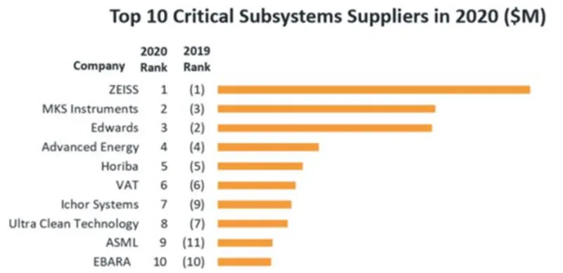 2000-2010 年伴随收购并购,行业持续整合,全球关键子系统前十大厂商的合计份额逐步提升,2010年以来前十大家的份额始终维持在 50%左右的水平。2020 年,蔡司仍占据第一位置,受益于对射频电源子系统的强劲需求,MKS 超过 Edwards 跃居第二。