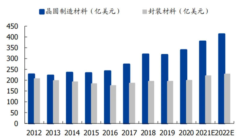 2021 年半导体市场规模超预期增长,且未来随着晶圆厂逐步投产,行业产值有望在2030 年超过万亿美元市场。从需求端来看,以汽车、工业、物联网、5G 通讯等代表的需求驱动驱动全球半导体产业进入“第四次半导体硅含量提升周期”。根据 SEMI,2021年全球半导体产值有望超过 5500 亿美元,达到历史新高,且在 2022 年根据 SEMI 对于行业资讯机构的统计,平均对于 2022 年的增长预期将达到 9.5%,即 2022 年市场规模有望突破 6000 亿美元(此为平均值)。此外随着全球 8 寸及 12 寸晶圆新产能逐步的在2022 年至 2024 年的投放,至 2024 年全球将会有 25 家 8 寸晶圆厂投产,60 座 12 寸晶圆厂投放。随着该 85 座晶圆厂的投放,至 2030 年全球半导体晶圆市场将有望达到万亿美元市场,实现年复合增长率约 7%。2021 年全球半导体材料市场规模创新高,中国大陆需求占比 18.6%。根据 SEMI,强劲的下游需求及晶圆产能的扩张驱动2021 年全球半导体材料市场规模同比增长 15.9%达到 643 亿美金新高。其中晶圆制造材料和封装材料市场规模分别为 404 亿美金和 239亿美金,同比增长 15.5%和 16.5%。晶圆制造环节中的硅片、化学品、CMP 和光掩膜环节是增速最快的几大领域,而硅片也是晶圆制造中成本占比最高的环节,市场规模超过130 亿美金。由于半导体芯片存在较大的价格波动,但是作为上游原材料的价格相对较为稳定,因此半导体材料可以被誉为半导体行业中剔除价格影响最好的参考指标之一。