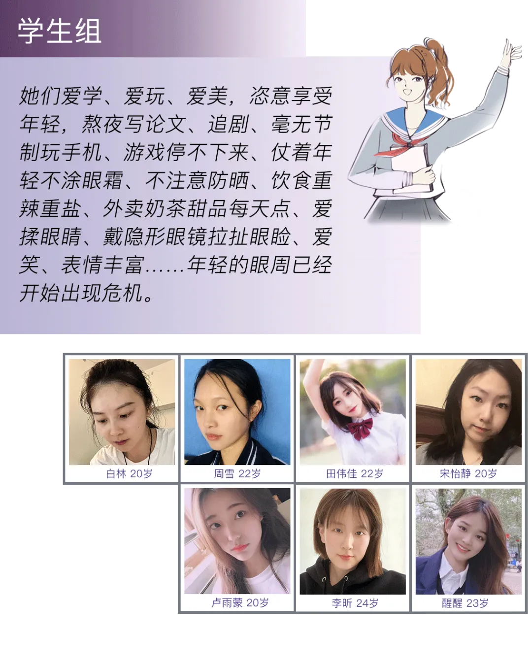 20岁还是学生的白林,之前她的问题就是仗着年轻持靓行凶,不涂眼霜,没有眼周护理意识,因此相较于更耐造的面部肌肤,脆弱纤薄的眼周肌已经早早出现危机,甚至有了较为明显的纹路问题。