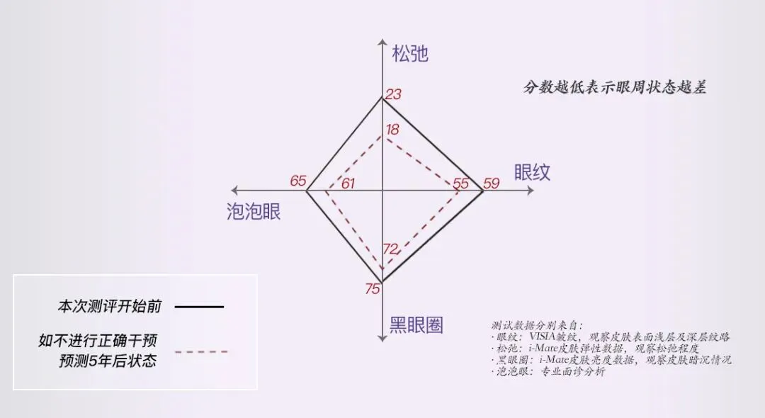 通过面诊发现在这14位年轻人的身上,果然都存在着多元化眼周问题。这里除了以上说的各种生活护肤方面的不良习惯,还因为她们疏于眼周护理,因为各种原因(累/懒/忙/眼霜顾虑)不去使用眼霜。而张博士也说,如果不尽早坚持使用适合的眼霜,对眼周问题进行正确的干预,任其如此发展,那么可以预见在5年之后,这些年轻人的眼周将会呈现更严重的老化状态,各项眼周问题的分数都会大幅变差。