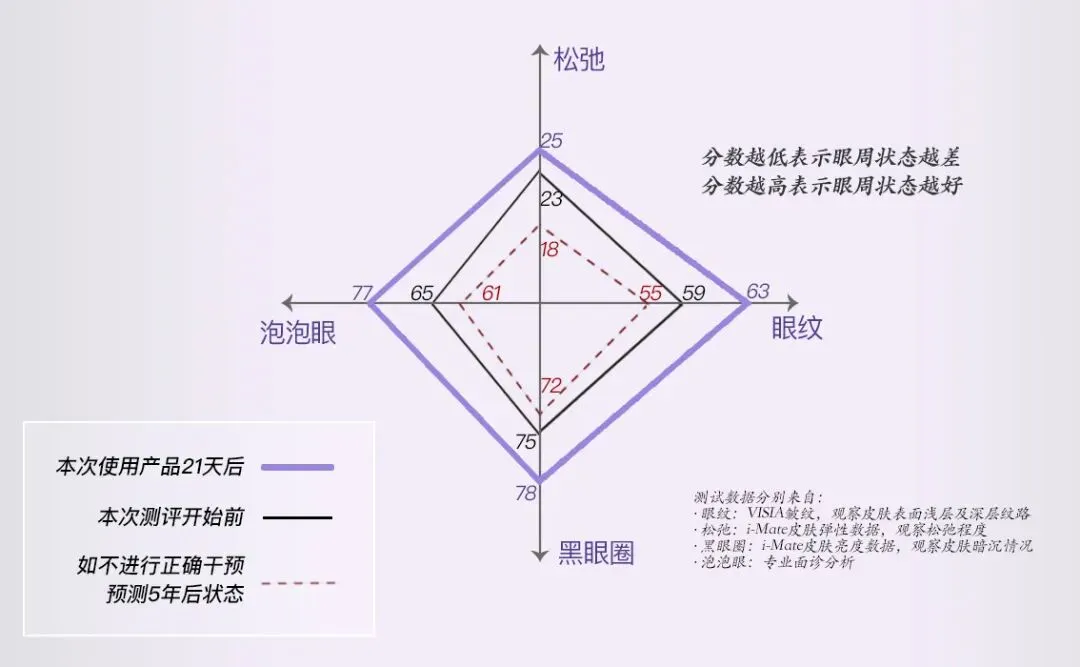 21天之后,我们也再次分析了眼周四大问题的分数,14人的平均分数都有提升,这是因为皮肤问题都在改善,科颜氏紫玻A眼霜在改善泡泡眼、黑眼圈、松弛和眼纹方面均有效果。并且照此趋势,如果能坚持使用,5年后眼部问题的发展将极大放缓,显著遏制眼周老化。