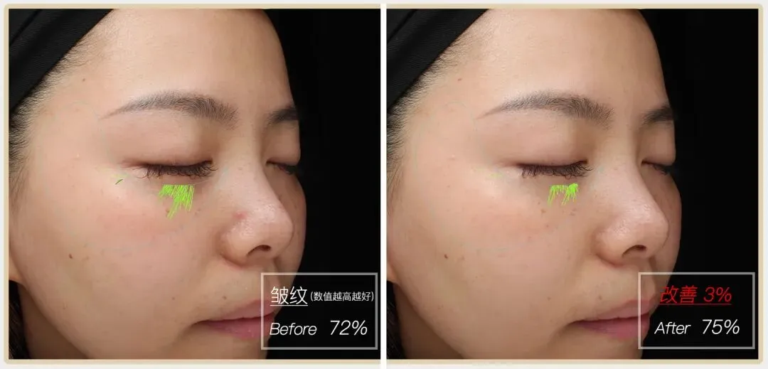 然而,在养成正确的眼周护理意识,早晚坚持使用科颜氏紫玻A眼霜之后,虽然没法戒掉熬夜的毛病,但眼周状态逆风翻盘,VISIA皱纹数据在3周之内改善10%,浅表纹路(黄色)数量大幅下降,深层纹路(绿色)在长度上也有缩短,实力淡眼纹。包括侧位图里也能很清晰看到对泡泡眼的改善,特别下眼皮轮廓明显紧致清晰起来,泪沟变浅变短。