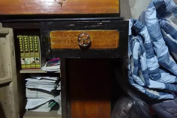床上的毛毯色彩鲜艳,在灯光下越发显得刺眼。床边有一个黄色的床头柜,抽屉里放着小龙的身份证、课本和记事本……边上有两床被子和几桶食用油,进门的地方还有几袋大米,是前几天民政局等政府部门送来的。