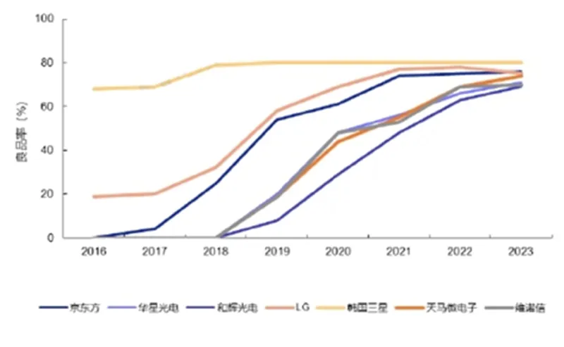 良率方面,近几年来以京东方、华星光电为代表的大陆OLED面板商良品率持续爬升,DSCC预计2023年三星OLED面板良率达80%左右,大陆厂商OLED面板良品率将主要居于70%-80%之间,与国际头部厂商差距进一步缩小。