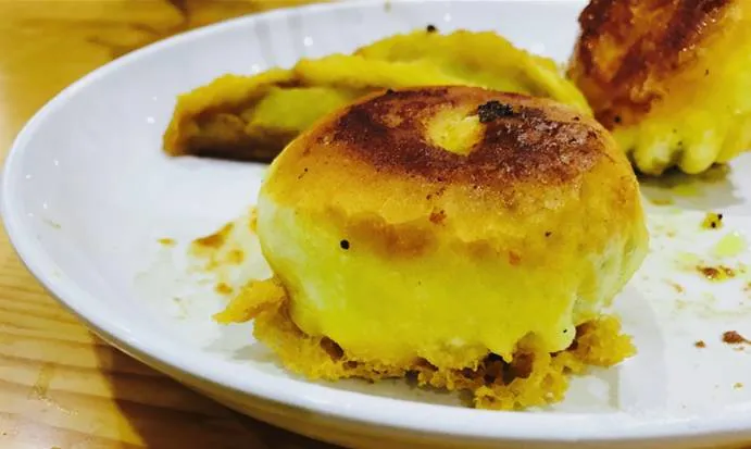 水煎包的面皮十分讲究,用“水发面”制成,形状像个加胖版的饺子。用平底锅煎时,在锅中倒入稀面浆,在锅中形成一层酥皮,薄若蝉翼,好看又好吃。
