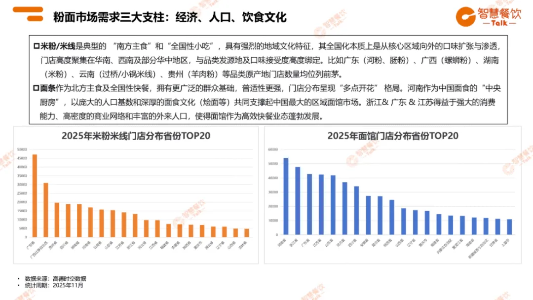 2025 年粉面品类告别野蛮扩张,迈入 “精耕细作” 的结构性优化阶段。全国粉面门店总量呈下滑态势,米粉米线门店从 36.6 万家降至 34.2 万家,降幅 6.6%;面馆从 64.5 万家降至 58.5 万家,降幅 9.3%,闭店数大于开店数,市场加速出清弱势门店。