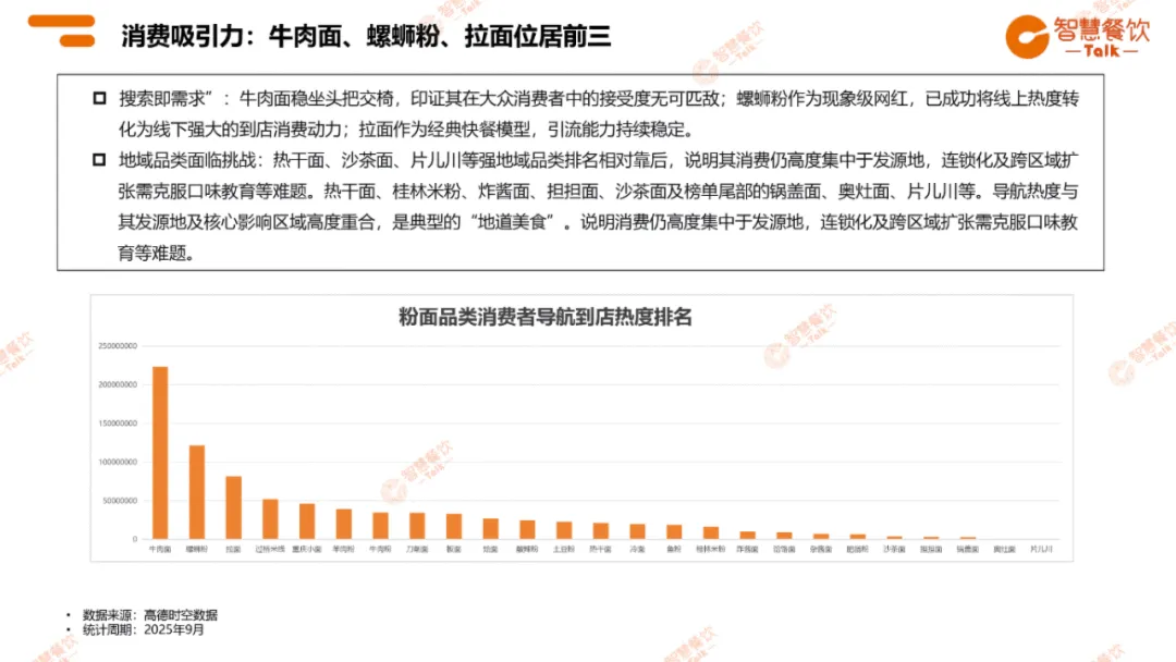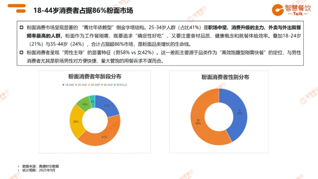消费者以 18-44 岁青壮年为主,占比 86%,且男性主导市场(58%)。牛肉面、螺蛳粉、拉面成为最具消费吸引力的品类,54% 的消费集中在 20 元以内,凸显普惠型民生快餐属性。门店超半数扎根社区,以低成本、高复购的 “熟客生意” 为核心逻辑。