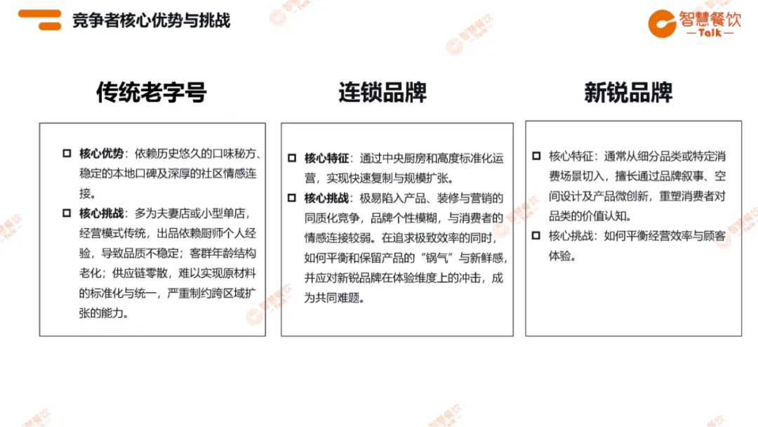 市场竞争呈现传统老字号、连锁品牌与新锐品牌三足鼎立格局。老字号凭借口味与口碑立足,但受限于传统模式难以扩张;连锁品牌依托标准化实现规模增长,却面临同质化难题;新锐品牌以创新体验突围,需平衡效率与体验。