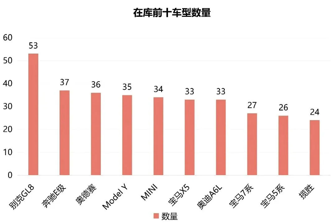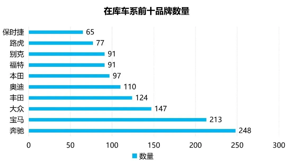 从在库车辆品牌和车型数量的数据维度分析,本月入库数量与上月相比有所减少,品牌在库量最多的前三名分别为:奔驰、宝马、大众,丰田、奥迪、本田、福特、分居第四、第五、第六和第七名,其他热门车辆品牌排名如上图表所示。