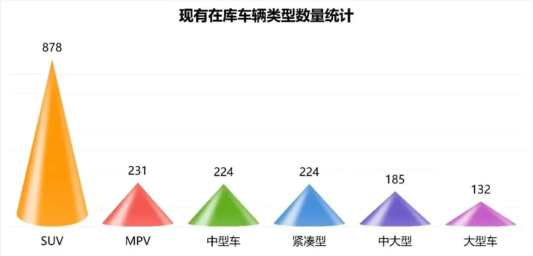 从在库车辆类型的数据维度分析,12月场内目前最多的车辆类型为SUV共878台,比上月环比增加约8.5%;其次为MPV车型231台,与上月持平;紧凑型(A级轿车)224台,比上月环比减少约3.9%;中型车(B级轿车)224台,比上月环比减少约2.6%;中大型车(C级轿车)185台,比上月环比减少约4.6%;大型车(D级轿车)132台,比上月环比增加约11.9%。