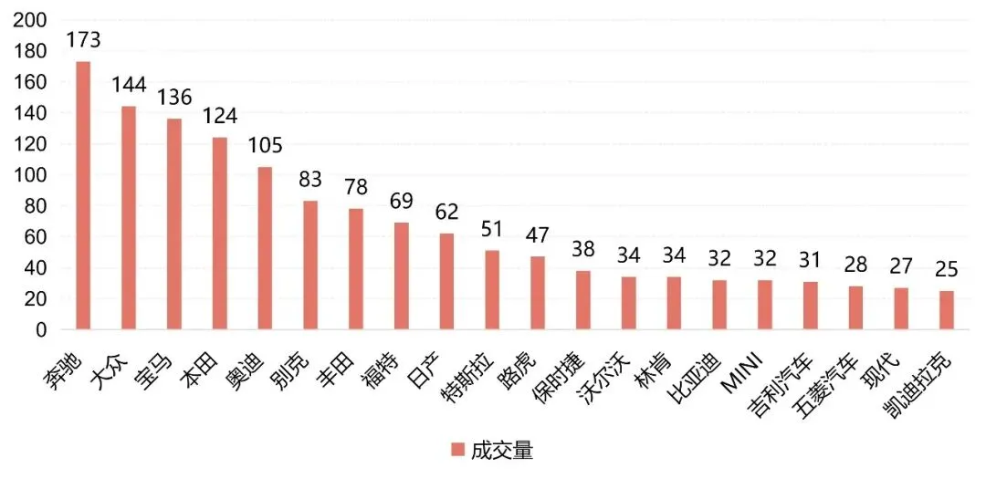 从各品牌成交的数据维度分析,12月份场内奔驰品牌车型成交量居多,共成交173台、其次为大众144台、宝马135台、本田124台、奥迪105台、别克83台......其他品牌如上图;综上所述,12月份各品牌成交车型与上月持平。