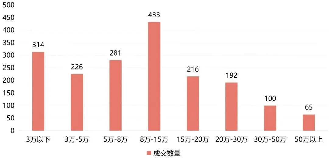 从成交金额区间维度分析,12月份,8-15万成交区间为各层的主要成交区间,其中在该区间内成交的车辆共433台,占总成交比的23.7%;20-30万区间内共计成交192台,占总成交比的10.5%。其中5-8万元区间共281辆,占总成交比的15.4%;15-20万元区间内共计成交216台,占总成交比的11.8%;