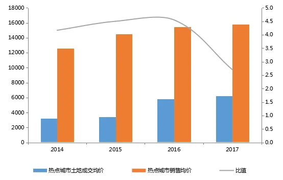 随着土地成交均价的上升、销售均价增速的放缓和房企融资成本的提升,2018年房企的净利润率持续提升存在较大压力。从数据上看,2017年热点城市销售均价与2016年土地成交均价比值大幅下降至2.7,主要由于2016年土地价格上升较快所致。