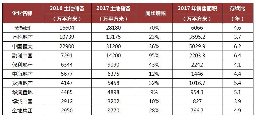 2017年,碧桂园土地储备2.8亿平方米,同比增长70%;融创土地储备1.4亿平方米,同比增长达到95%,相较2016年,几乎翻了一番。同时多数房企存续期超过4年,龙头房企土地资源充裕,足够企业未来好几年的发展。