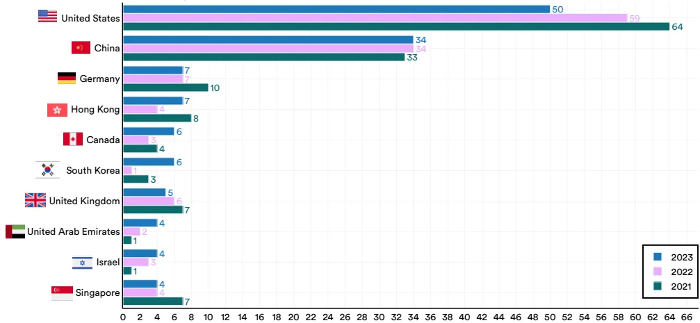 在模型开发方面,美国继续保持领先地位。2024年,美国机构开发了40个重要AI模型,远超中国的15个。然而,中美模型之间的性能差距正在显著缩小。