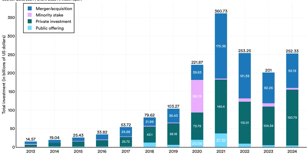 2024年,全球AI私人投资达到2523亿美元,同比增长26%。其中,生成式AI投资尤为抢眼,达到339亿美元,占全部AI投资的20%以上。