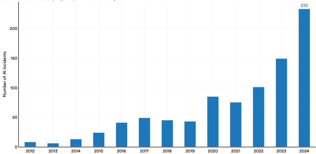 随着AI能力提升,负责任AI问题日益凸显。2024年报告的AI相关事件达到233起,同比增长56.4%。模型偏见问题仍然存在,即使是被设计为无偏见的模型,仍表现出隐性偏见。