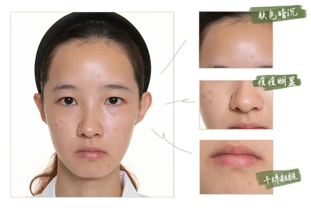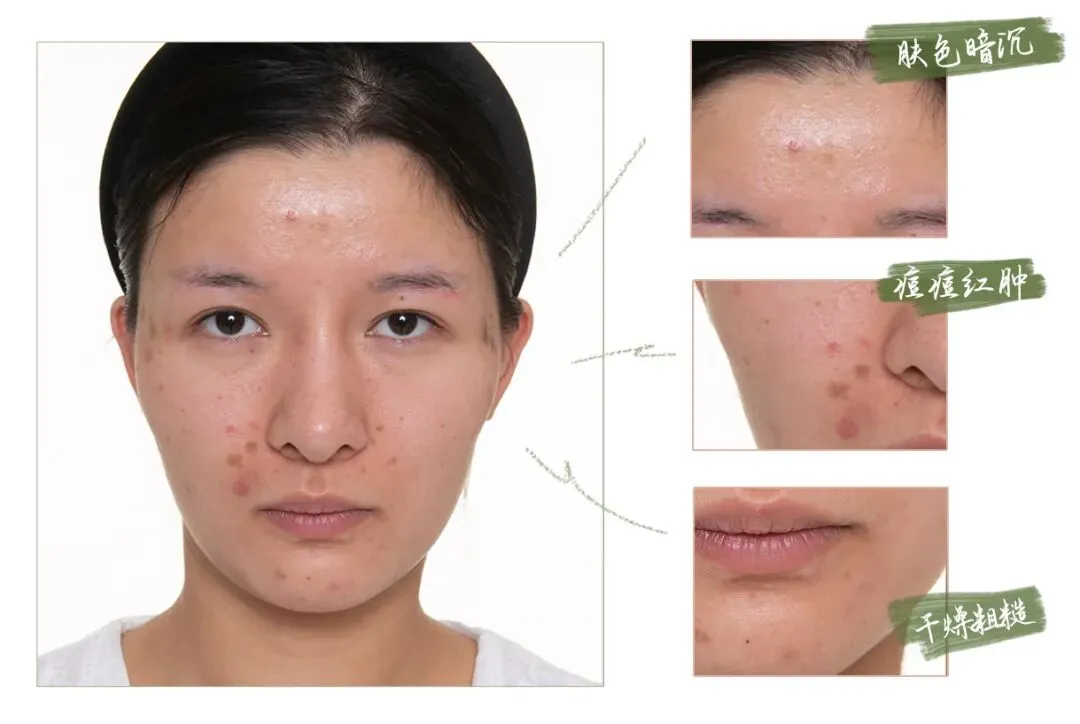 别吃糖,皮肤会「黄」——由于工作关系导致日常糖分摄入严重过量,皮肤糖化现象严重,肤色暗沉油腻且局部反复发痘,留下了难消的痘印。皮肤整体质感较差,焦糖脸十分明显。