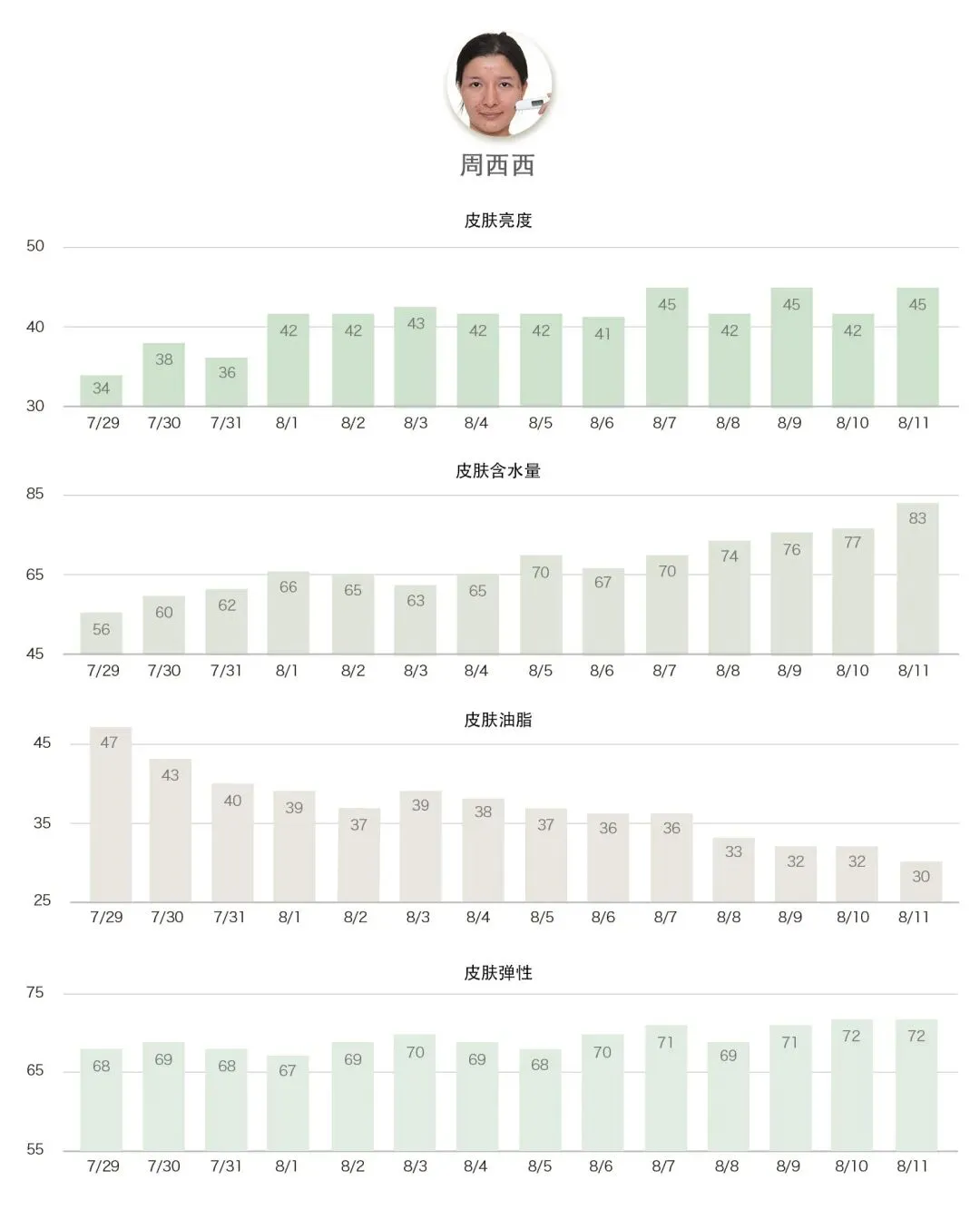 数据层面,水油数据的变化非常明显。此外,值得关注皮肤弹性数据的变化,糖化反应的一个重要影响就是令皮肤弹性变差,加剧老化。而周西西的指标在两周时间内均有不同程度的改善,证明悦木之源灵芝双星不仅具有强大的维稳修护力,更能强力抗糖化,帮助祛黄提亮摆脱焦糖脸。