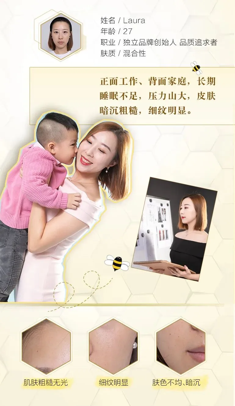 生过宝宝之后,Laura的皮肤状态一泻千里,就是我口中的“感觉用什么都提不起气”。她试过更贵的抗老面霜,但这次21天的体验让她彻底变成了娇兰的死忠粉,非常非常喜欢黄金复原蜜,每次只需几滴就能马上润泽全脸,“一秒钟皮肤就变软变弹的感觉实在太美妙了”。