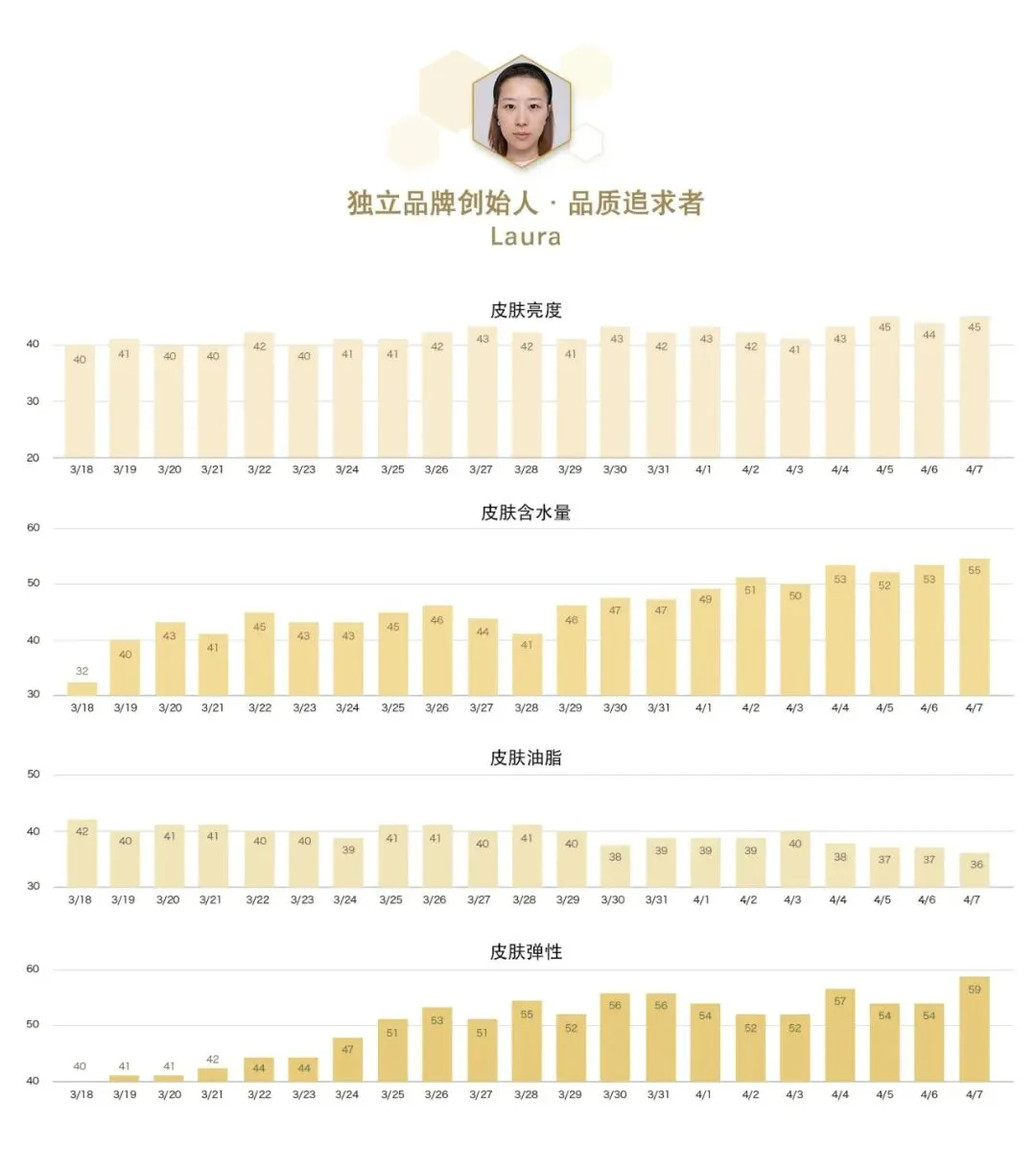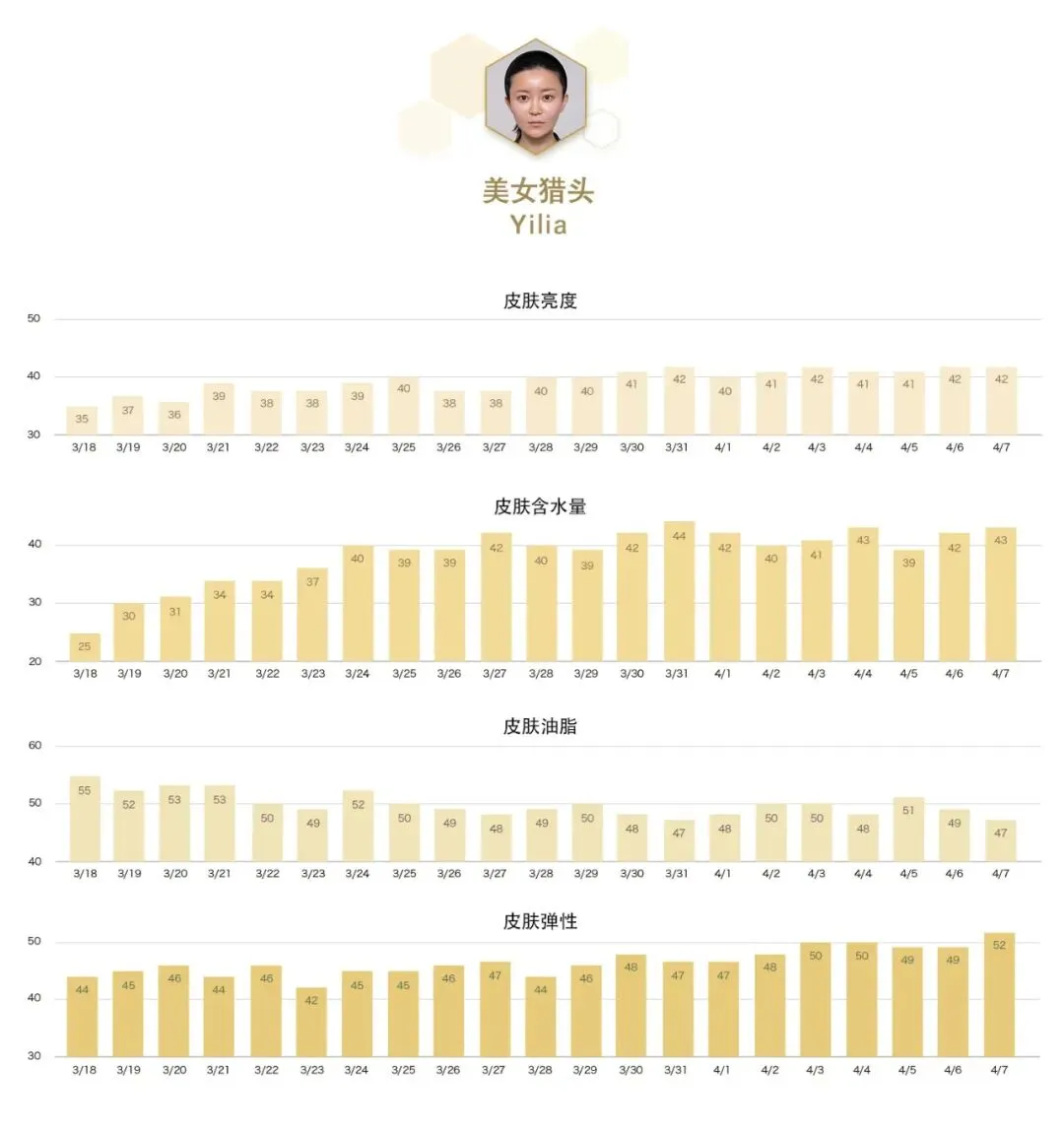 熟龄肌面临的两个棘手问题:皮肤越来越干,弹性越来越差。而在这次Michelle的数据来看,反映肌肤年轻指数的两个关键指标:水分含量及弹性指数都得到了大幅提升,尤其是皮肤含水量在第一周就迎来了一次大的提升,真的令人非常惊喜;另外亮度维持高位表现,油脂分泌较之前更加平缓,带来皮肤状态的全面提升。