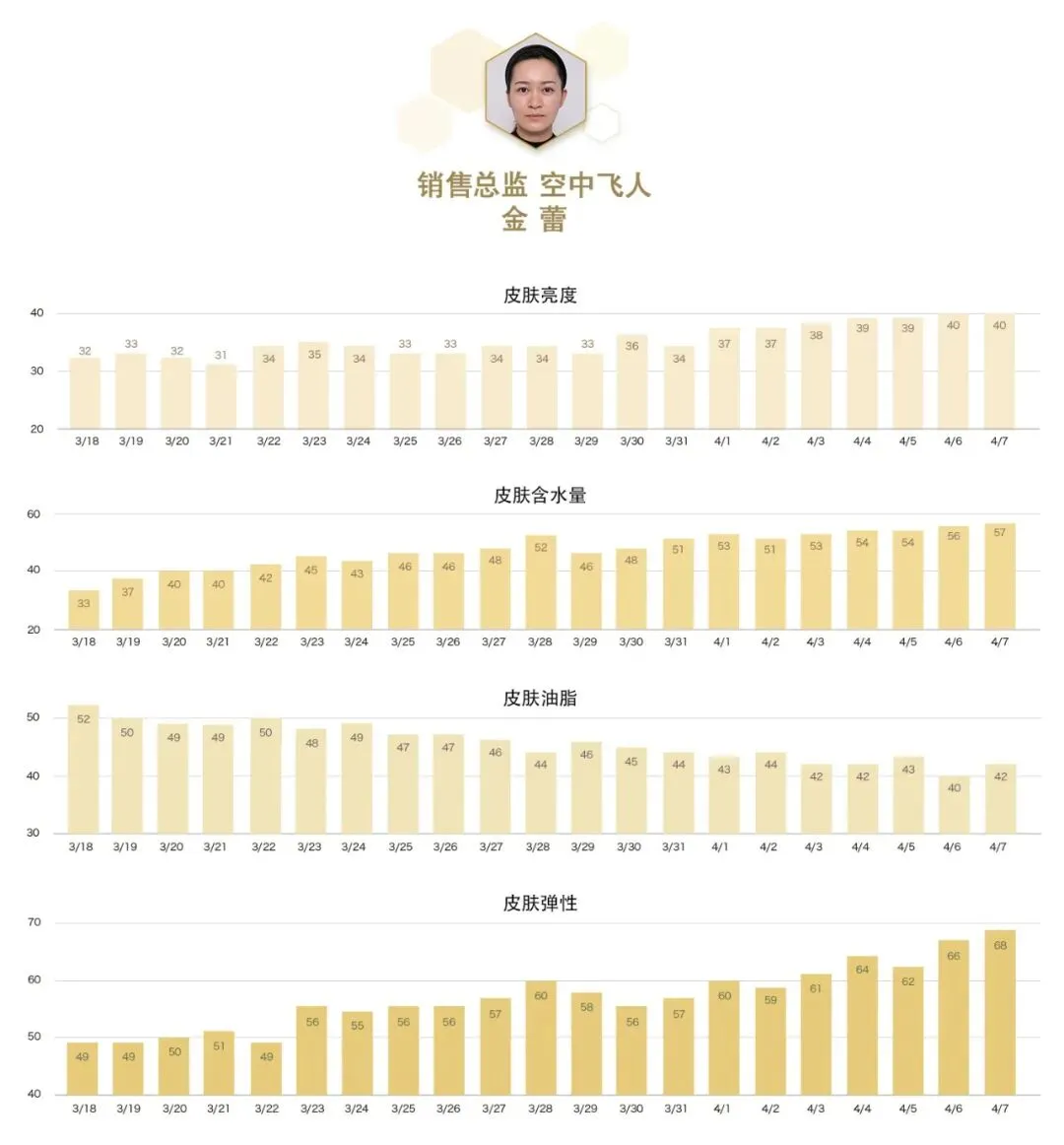 至于数据层面,所有人体现角质层含水量和油脂的数据都在改善,代表角质层水油恢复平衡,同时皮肤亮度及肌肤弹力稳步提升,实力盖章娇兰黄金修护系列,御年轻,愈美丽的美丽承诺——21天职场精英高压肌,挑战成功!