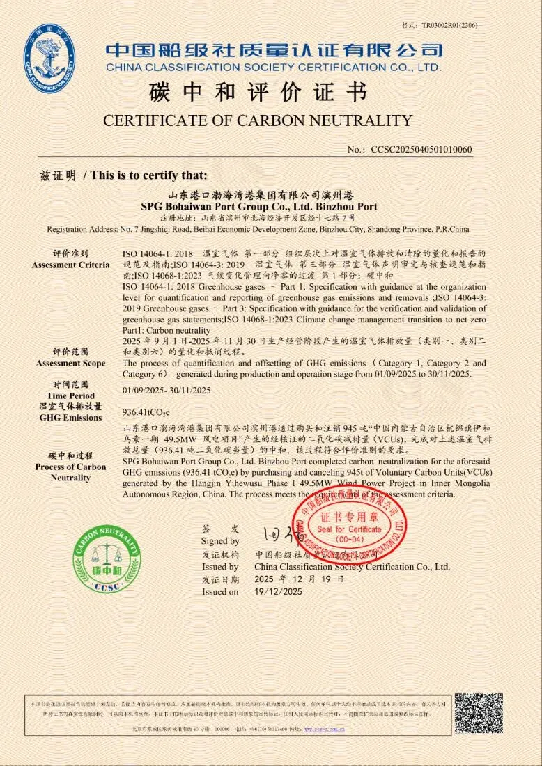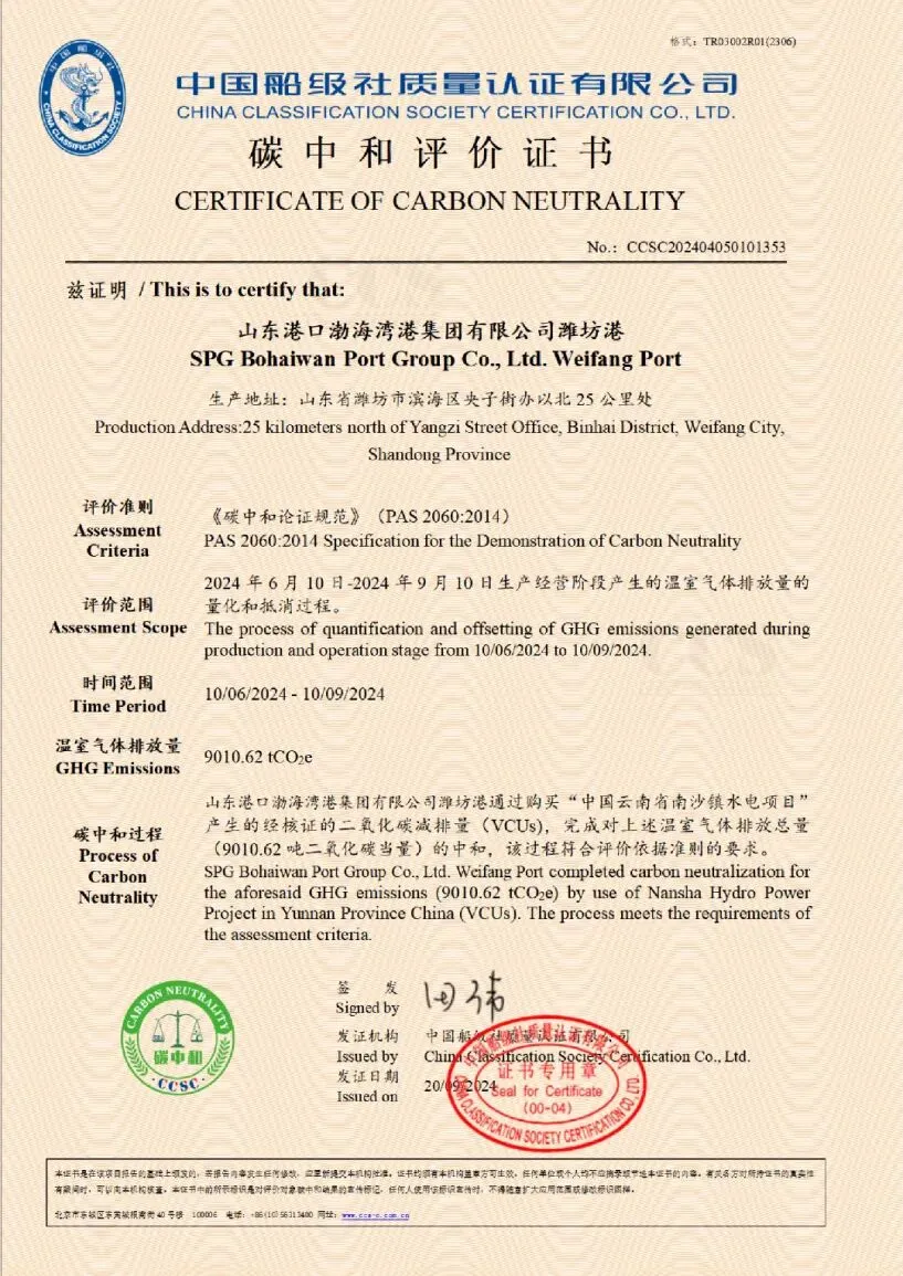山东港口渤海湾港颁发《碳中和评价证书》