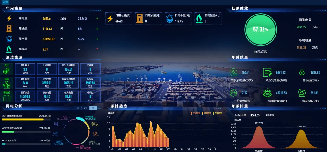 实践是检验真理的唯一标准。在具体行动中,渤海湾港坚持以科技创新为驱动,以具体项目为支撑,推动零碳建设落地见效。在能源优化方面,建成以“26.8MW风电+20MW光伏+35MWh储能”为核心的一体化绿色能源供应系统,年清洁电力产能达9200万KWh,实现全港域100%绿电覆盖,从源头减少了能源消耗;在智能升级方面,渤海湾港搭建起集团层级的综合能碳智慧管控平台,年用能成本直接降低超1200万元,减碳7.5万吨;在产业链协同方面,渤海湾港助力达成山东港口首笔绿证交易等,积极推动上下游企业共同参与降碳行动,为绿色能源市场化流通探索了有效的发展路径。系列成果的不断涌现,不仅体现了渤海湾港的创新理念和发展路径的先进性,更彰显了山东港口推动绿色低碳高质量发展的坚定决心,以实际行动有效筑牢港口绿色发展根基。