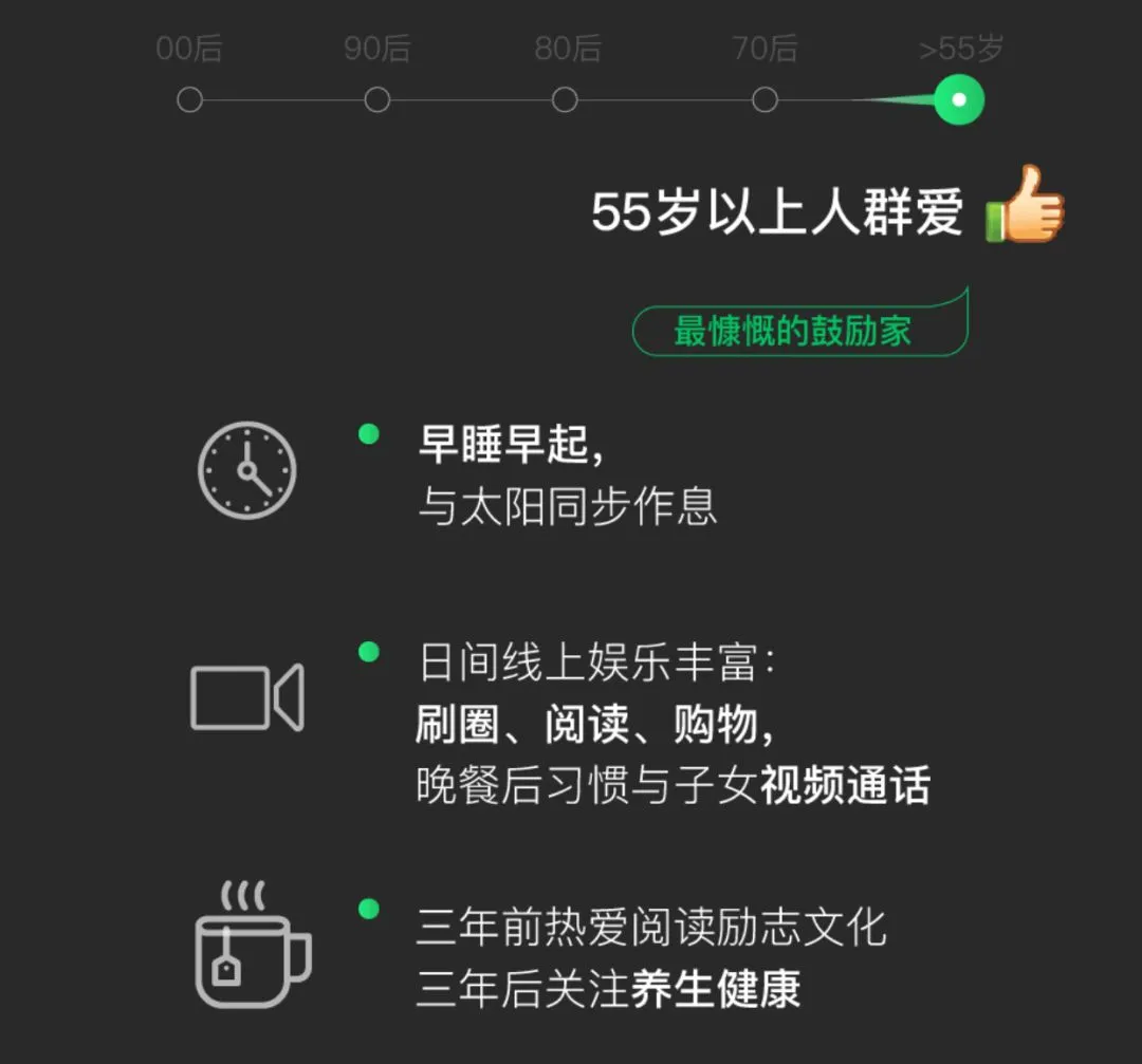 55 岁以上,爱养生,爱视频通话、爱早睡早起。